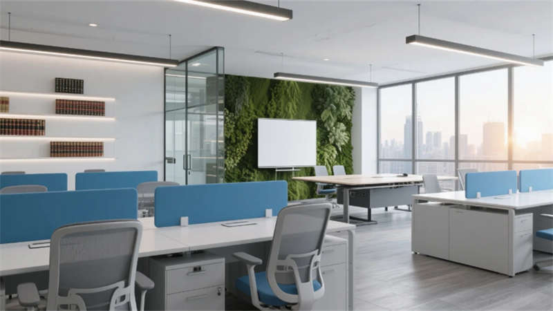 入口處弧形接待臺似律法天平,發(fā)光企業(yè)標識懸浮于透光大理石背景墻,線性燈光如正義之軌延伸至開放式辦公區(qū)。玻璃幕墻外合肥城市天際線成為動態(tài)畫布,智能升降桌與模塊化工位詮釋高效協(xié)作。合伙人辦公室的270°環(huán)景視野,將巢湖煙波與都市繁華收于案頭,霧化玻璃在私密與開放間自由切換。