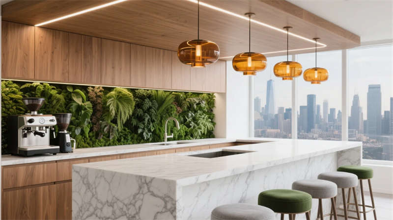 階梯式沙龍區(qū)打破傳統(tǒng)會(huì)議格局,弧形看臺(tái)激發(fā)平等交流,全息投影讓思維可視生長(zhǎng)。茶水間垂直花園與咖啡香氣交織,成為非正式碰撞火花的土壤。獨(dú)立辦公區(qū)低隔斷設(shè)計(jì)延續(xù)視野通透,曲線燈帶如枝蔓延伸,提示著人與空間的有機(jī)聯(lián)結(jié)。