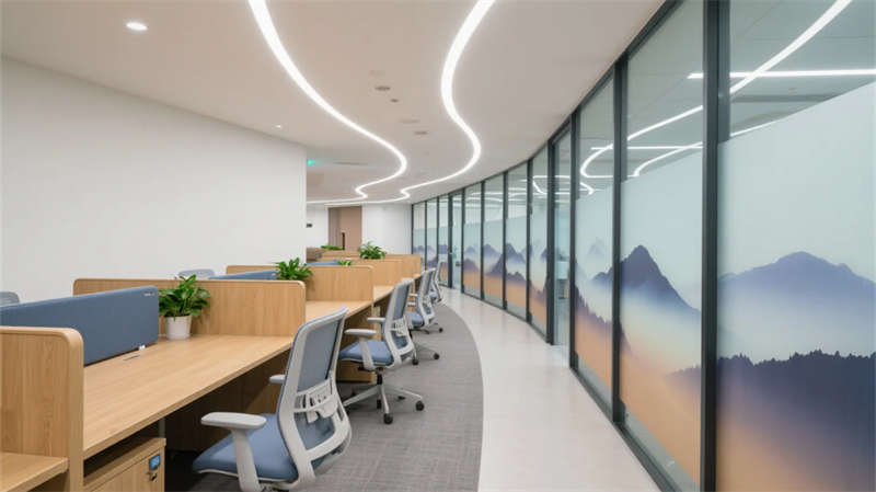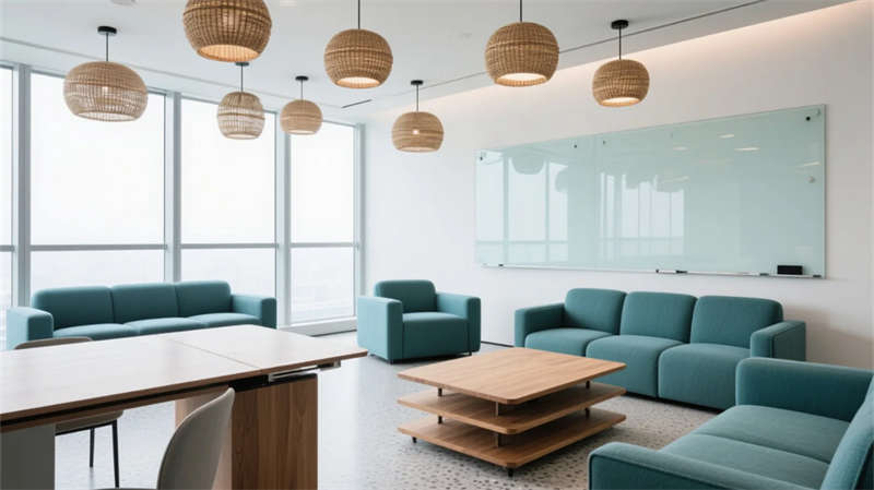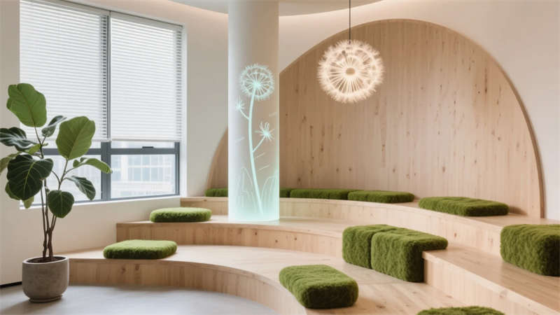 智能會(huì)議艙化身科技繭房,霧化玻璃平衡開(kāi)放與隱私,觸控桌面簡(jiǎn)化流程。貫穿始終的暖木、灰白與苔蘚綠,在全景天光下沉淀出寧?kù)o能量。此處不僅是工作容器,更是蚌埠創(chuàng)新浪潮下,滋養(yǎng)靈感、尊重個(gè)體的未來(lái)生態(tài)聚落。