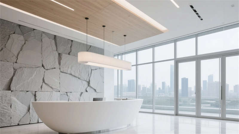 這座辦公空間以「自然共生」為脈絡(luò),將科技智能隱于溫潤(rùn)質(zhì)感之中。入口處生態(tài)前臺(tái)以洞石與苔蘚破界對(duì)話,定調(diào)空間的生命力;開(kāi)放協(xié)作區(qū)如流動(dòng)的創(chuàng)意河谷,模塊家具隨需求自由重組,綠植隔斷悄然凈化空氣;散落的靜音艙與冥想穹頂,為深度思考提供呼吸間隙。
