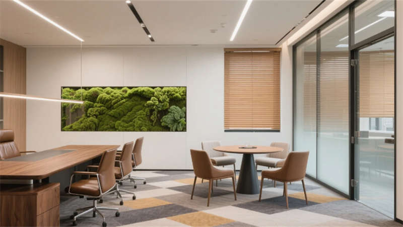 生態科技體系覆蓋全場景:經理辦公室苔蘚墻集成空氣監測系統,總裁室霧化玻璃聯動光伏發電,小會議室綠植墻搭載微滴灌節水裝置。材質選用安徽本土元素升級再造,大廳水磨石摻入大別山礦石粉,定制地毯紋樣提取徽派窗欞數字化變體。