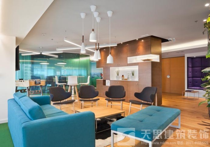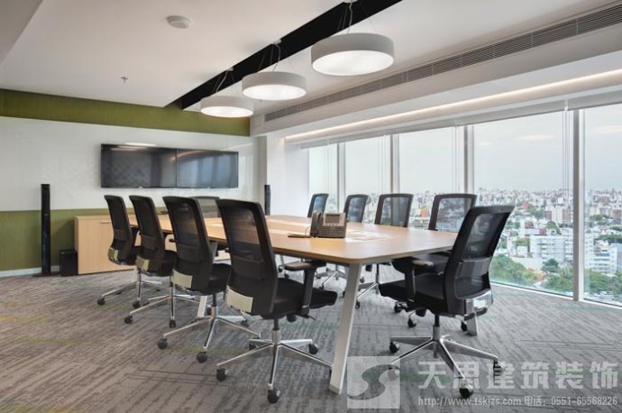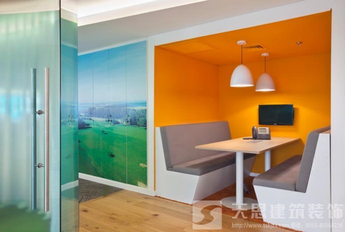 會議室的設(shè)計:設(shè)計師在設(shè)計的時候,將其安置在靠近窗戶的空間區(qū)域中,在設(shè)計師看來會議是企業(yè)發(fā)展所不可替的,但是設(shè)計師希望可以改變會議室給人枯燥、無味的感覺,故此設(shè)計師將采光、室外景色通過設(shè)計的手法將其引入室內(nèi),讓會議變得有趣起來。