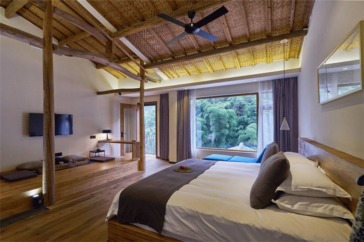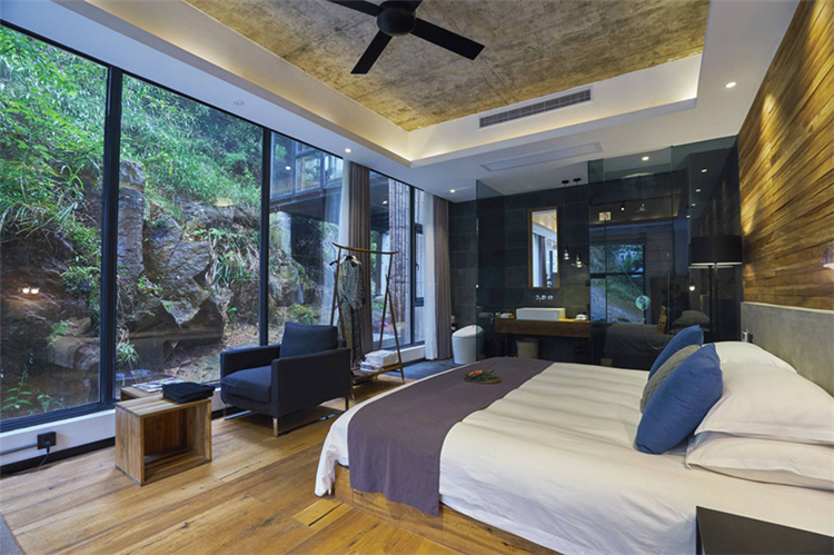 玻璃為墻、為窗,鋼結構吊頂,木色為板,與周圍環境相得益彰,仿佛置身山間之色;睡醒的清晨,清新的空氣迎面而來,拂去懶懶睡意;用山間的寧靜,洗去旅途疲勞,或者城市的浮華與躁動,體味另一番人生心境。