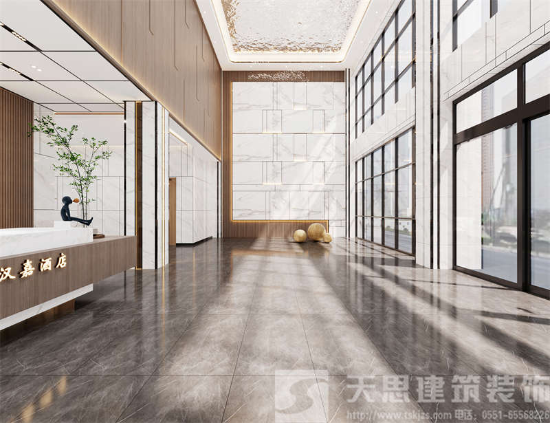 徽派元素現(xiàn)代表達(dá):大堂可融入徽派建筑的“天井”結(jié)構(gòu),搭配鏤空木雕屏風(fēng)、青磚墻面,頂部以現(xiàn)代玻璃材質(zhì)覆蓋,形成傳統(tǒng)與現(xiàn)代的光影對話。