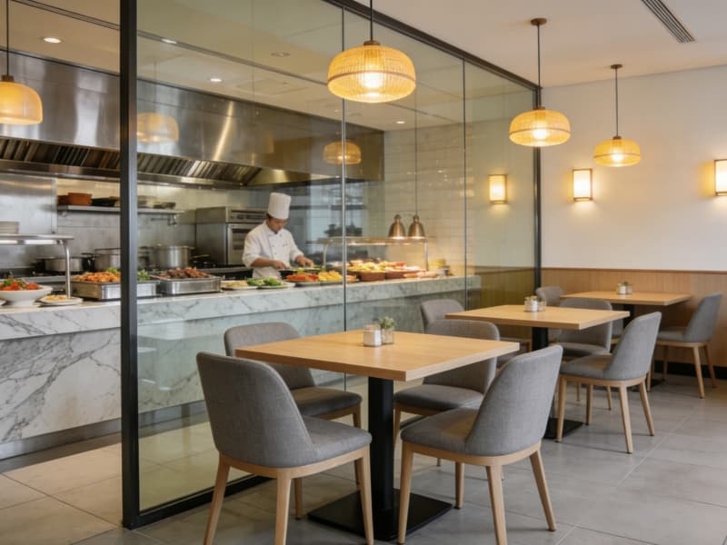 酒店一層為公共區(qū)域,大堂地面鋪淺灰色大理石,前臺背景墻以巖板結(jié)合藝術(shù)裝置,彰顯格調(diào)。大堂吧設(shè)半私密卡座,供客人休憩交流。全日制餐廳配備開放式廚房,可讓客人直觀感受美食制作過程。