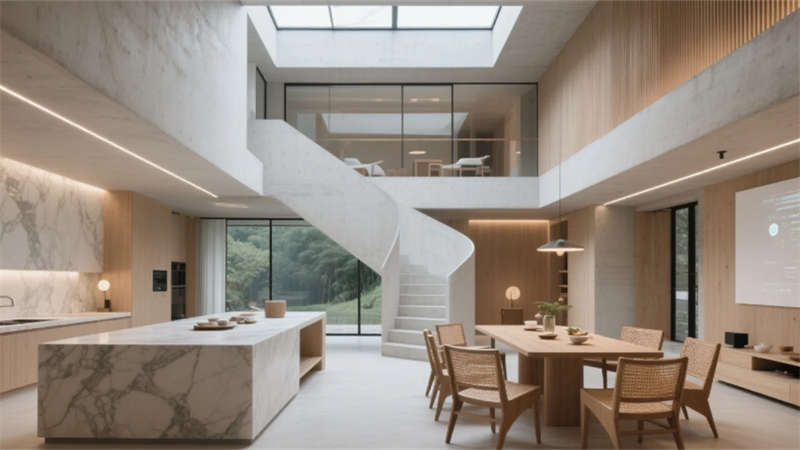 客房以極簡的智慧回應(yīng)棲居本質(zhì)。榻榻米地臺消弭床與地面的界限,270°環(huán)景霧化玻璃輕觸即透,仿生綠植在智能光影中呼吸生長,隱藏式投影幕布落下時,星空與林海皆成私享背景。階梯書吧的垂直綠植墻下,模塊化沙發(fā)隨需求自由組合,全息粒子在空氣中勾勒出流動的藝術(shù),而巖板中島餐廳里,藤編座椅與吊燈矩陣的光暈交織,智能調(diào)光天窗讓每一餐都浸染著天光的溫度。