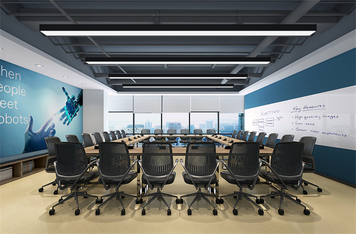 2、該辦公室裝修項目主要是使用者作為科技類產(chǎn)品的研發(fā)空間,要求足夠?qū)挸ǎ臻g的開放度與靈活度自由變換,辦公桌實現(xiàn)可隨意拼裝組合。設計師在設計上立足于;靈活共享的主線,以設計、現(xiàn)代、開放和連通為主題,著眼于科技發(fā)展的今天和未來,創(chuàng)造出一個極富時代感和超前性的辦公空間。整個辦公空間以白色為基底色,輔以藍色的協(xié)調(diào)、中和,黑、 白、藍成為標準層的主色系,完美將辦公層的空間格局進行分割,營造出現(xiàn)代簡約、自由開放的高端科技感。長方形燈具應用突出了現(xiàn)代科技的嚴謹態(tài)度,極大凸顯企業(yè)的文化感與產(chǎn)品前沿的設計感。會議室根據(jù)實際需求,實際軟裝時則以多彩元素為主題,一眼望去 ,布滿了明快的顏色 ,活潑卻不繁雜 ,采用的半透明亞克力玻璃椅是點睛之筆,帶給空間無限的靈動感。黑板漆墻面設計則豐富了使用者的功能需求,達到裝飾和功能并存的目的。靈活的辦公桌還可自由變換,滿足不同需求的會議要求。