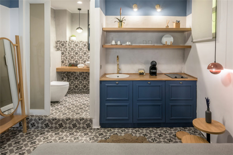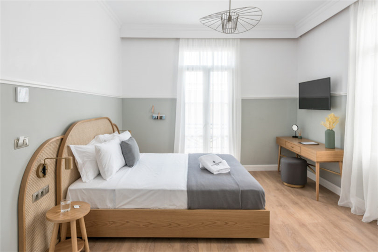 所有的地板都換成了天然橡木板和幾何水泥瓦。在整個客房中有一些小的現代細節(jié):如皮革墻壁掛鉤,極簡主義的植物增添了現代感。