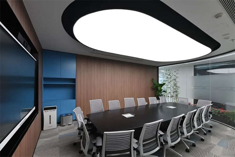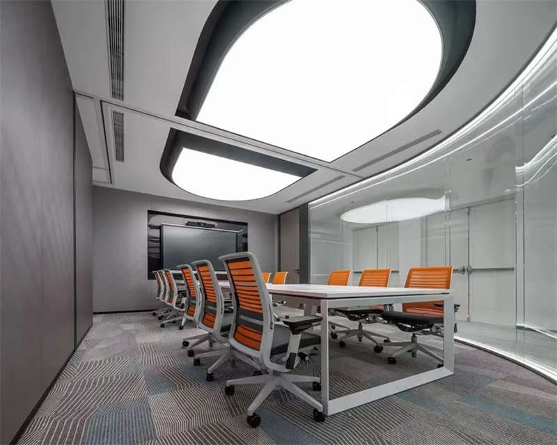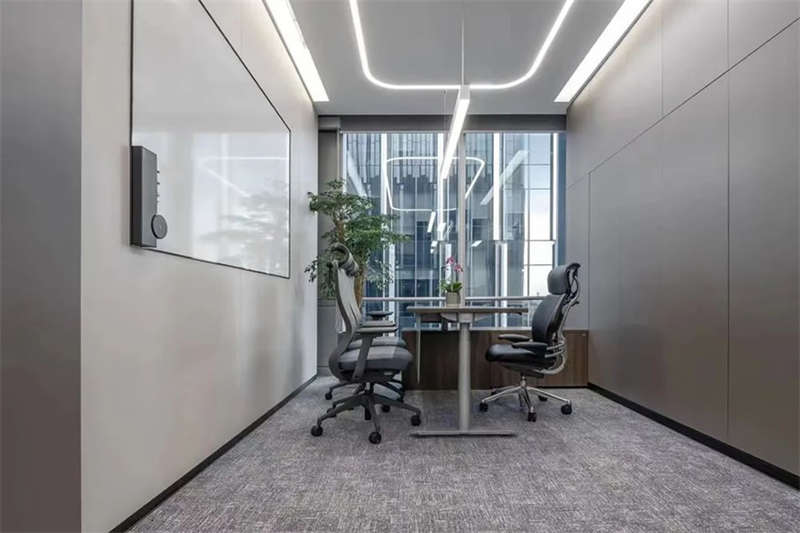 在接待前廳左右兩邊各設(shè)置了一個大會議室,其中一個是現(xiàn)代酷灰的可二合一的會議室,另一個是穩(wěn)重優(yōu)雅的行政會議室。感謝成品隔斷供應(yīng)商卡萊斯卓的緊密配合和支持,在設(shè)計師的要求下,把LED燈帶嵌入了雙層玻璃隔斷中。讓整個會議室區(qū)域看上去充滿科技感!