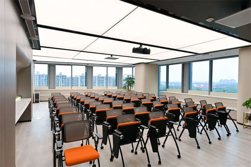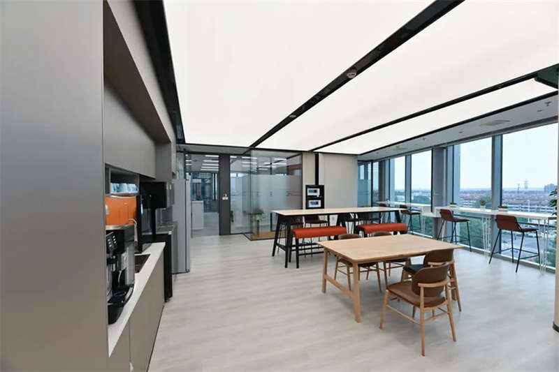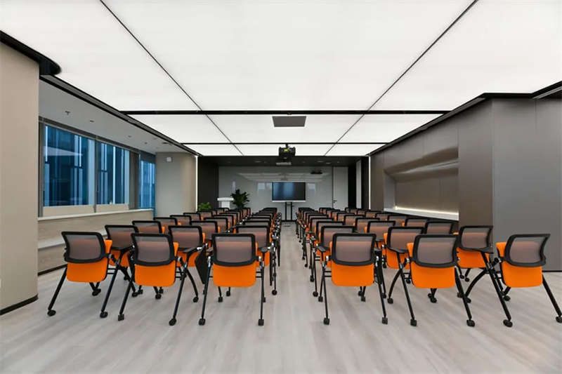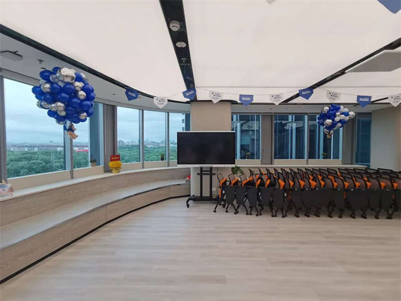設(shè)計團(tuán)隊特意選擇了一處大型開敞的臨窗場地,在酷炫的3D裸眼展示室旁邊打造出了一個4S店風(fēng)格的培訓(xùn)和茶水的二合一空間,以滿足客戶快速發(fā)展的團(tuán)隊培訓(xùn)和新品發(fā)布的需求。在臨幕墻的位置,設(shè)計師原來就設(shè)計了一排沿窗的休閑階梯造型臺階,后來因為疫情防控的需求,把臺階內(nèi)的空間利用好,平時內(nèi)部可以儲藏睡袋,防疫物資,帳篷等物品。