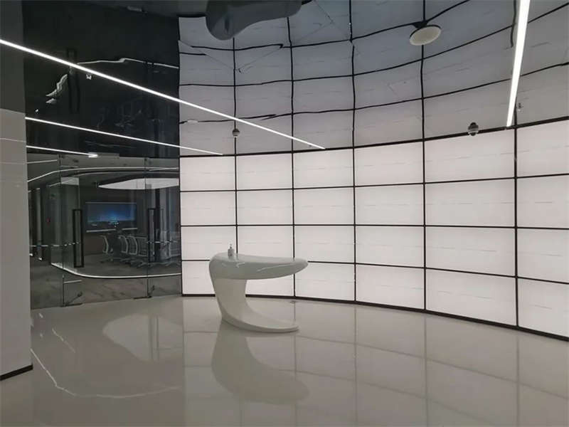 在電梯出來,一步入半圓弧的接待前廳,馬上看到的是以安全氣囊元素為主創(chuàng)意的,帶燈光變化的半弧造型墻,時尚大氣。在這純粹的黑白灰空間里,一個純白色飛馳動感造型的前臺安安靜靜的擺設(shè)在那,在不使用的時候,它也是一個時尚的藝術(shù)品。和背鏡墻相結(jié)合,體現(xiàn)了速度與安全的設(shè)計理念。
